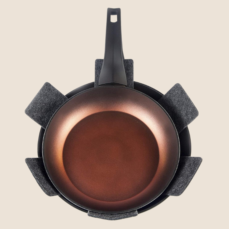 Protector de sartenes diseñado para proteger tus utensilios de cocina frente a golpes, rayaduras y desgaste al almacenarlos.